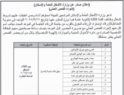وفي سياق متصل، دعت وزارة الأشغال العامة الأسماء في الجداول أدناه لإجراء الفحص العملي.