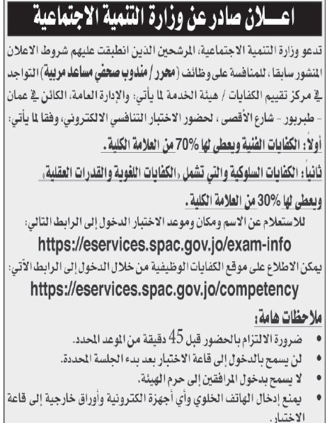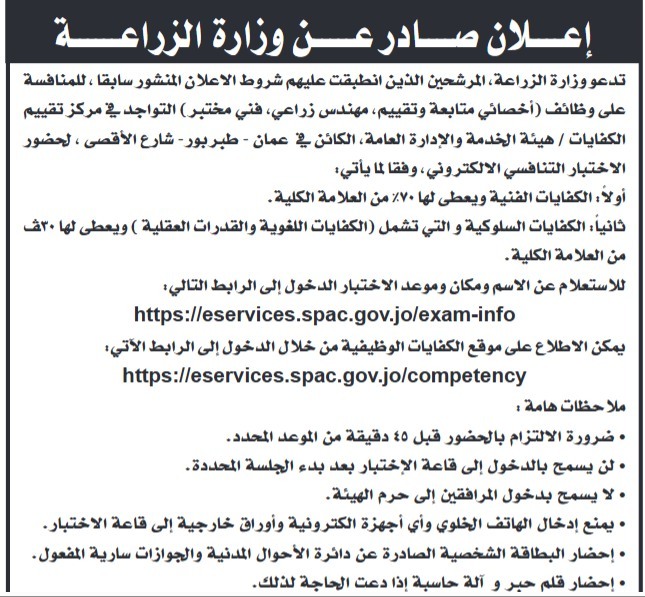 دعت وزارة التنمية الاجتماعية ووزارة الزراعة المتقدمين الذين انطبقت عليهم شروط الإعلان المنشور سابقًا للتوجه إلى مركز تقييم الكفايات في هيئة الخدمة المدنية، الكائن في عمان طبربور، لحضور الامتحان التنافسي الإلكتروني.