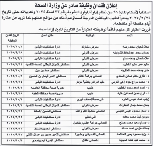 أخبار البلد - أعلنت وزارة الصحة عن فقدان عدد من الموظفين لوظائفهم، وذلك استناداً لأحكام المادة (96) من نظام إدارة الموارد البشرية رقم (33) لسنة 2024 وتعديلاته حتى تاريخ 24 فبراير 2025، وذلك بسبب التغيب غير المبرر عن مواقع العمل لمدة تزيد عن عشرة أيام، سواء كانت متصلة أو متقطعة.