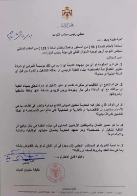 موضوع خصخصة أو تشغيل وإدارة ميناء العقبة الرئيسي، ويتضمن استفسارات تفصيلية من خمس نقاط، أبرزها: