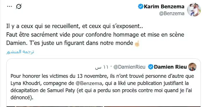 وكتب الصحفي داميان ريو عبر حسابه على موقع إكس:" لتكريم ضحايا 13 نوفمبر، لم يجدوا سوى لينا خودري، شريكة بنزيما، التي أعجبت بمنشور يبرر قطع رأس صمويل باتي (وخسرت دعواها القضائية ضدي عندما استنكرتُ ذلك)".