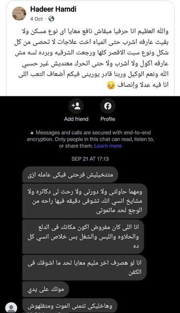 قبل وفاتها بساعات، نشرت هدير عبر حسابها على "فيسبوك" رسالة مؤثرة، قالت فيها: "والله العظيم مبقاش نافع معايا أي نوع مسكن… ولا بقيت عارفة أشرب حتى المية… سيبت الأقصر ورجعت الشرقية… وبرضه لسه مش عارفة أتحرك. معنديش غير حسبي الله ونعم الوكيل… ربنا قادر يوريني فيكم أضعاف التعب اللي أنا فيه."