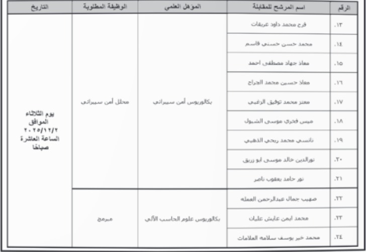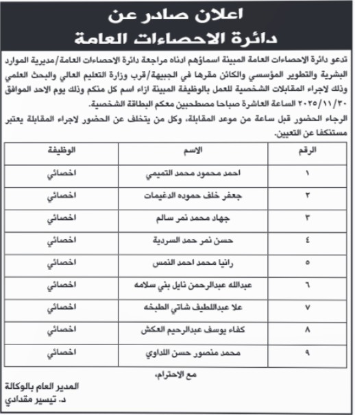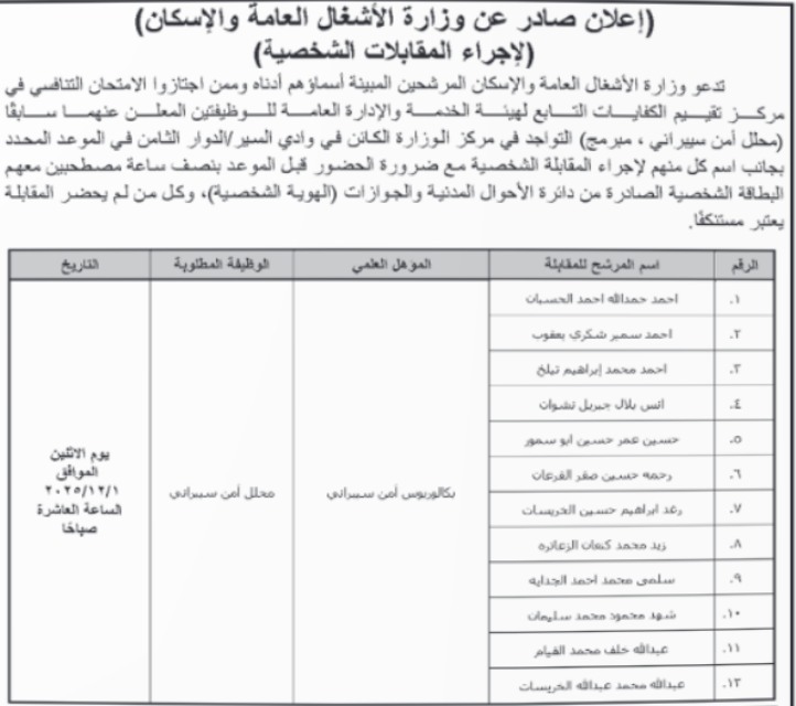 دعت مؤسسات حكومية، اليوم الاحد التالية أسماؤهم لاجراء المقابلة الشخصية.