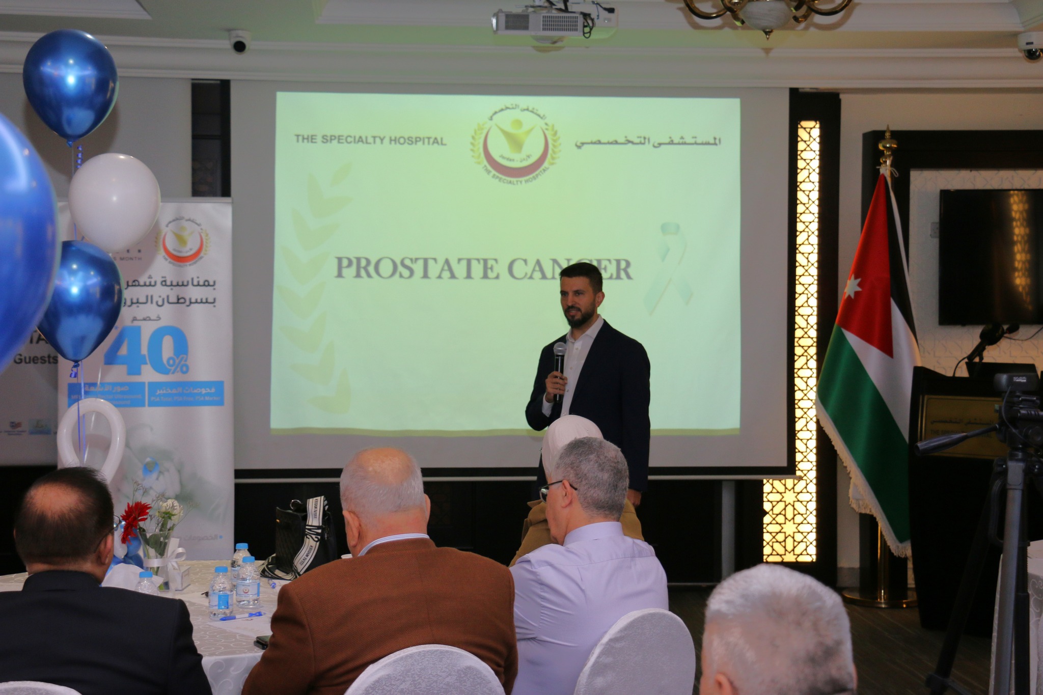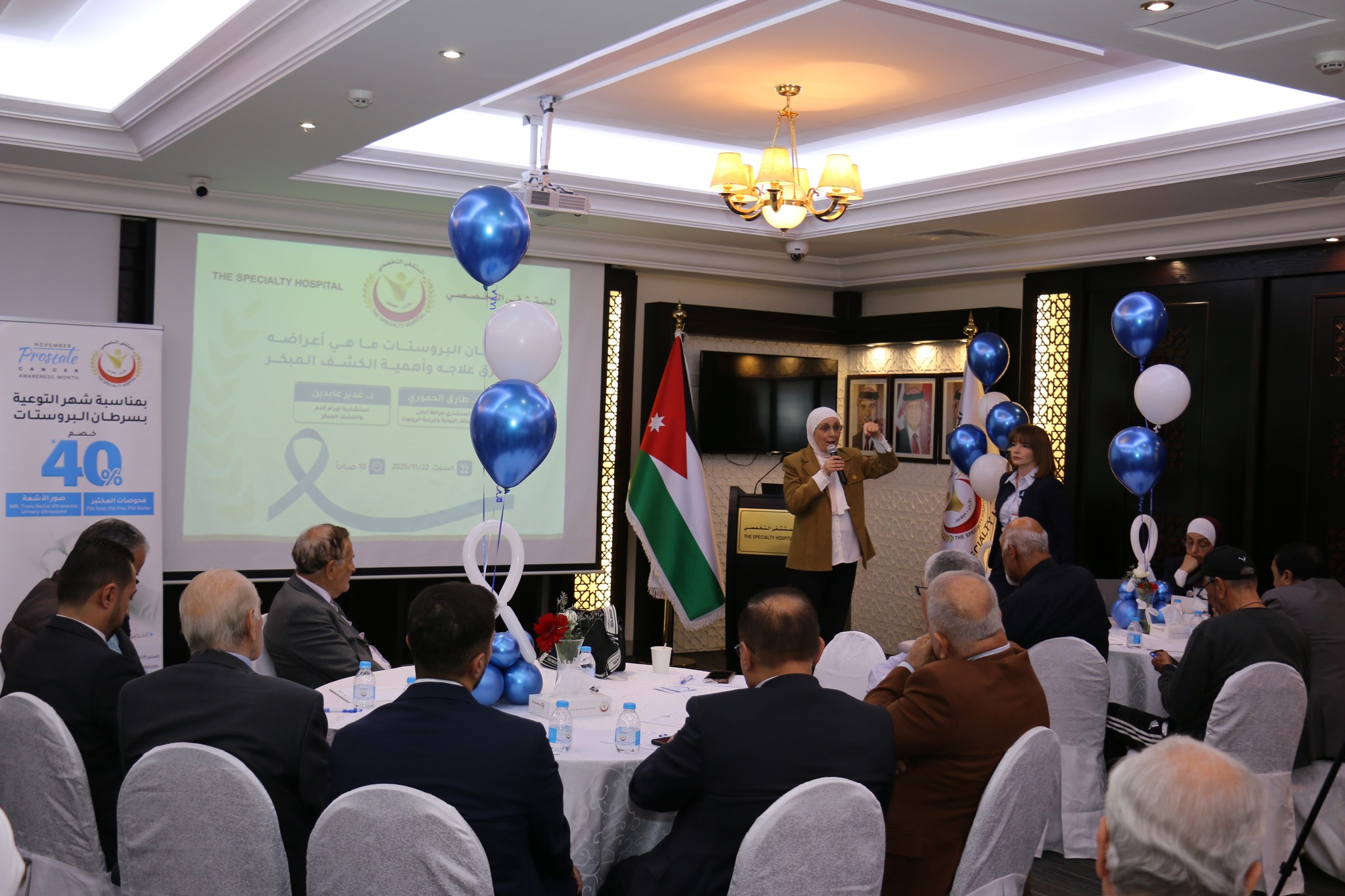 قدّم الدكتور طارق الحموري، استشاري جراحة الكلى والمسالك البولية وجراحة الروبوت، محاضرة تناول فيها أهمية الكشف المبكر لسرطان البروستات ودوره في تحسين فرص الشفاء وتقليل المضاعفات، وأكد على أهمية الفحص الدوري للرجال، خصوصاً لمن لديهم تاريخ عائلي بالسرطان، واستعرض دور غدة البروستات وأهميتها والأمراض المرتبطة بها والعمليات الجراحية التي تُجرى لها. كما أعلن أن المستشفى التخصصي يستعد خلال الفترة المقبلة لإدخال تقنية الروبوت الجراحي لعمليات استئصال البروستات ليصبح أول مستشفى في الأردن يعتمد هذه التقنية المتقدمة، بما يعزز مستوى الخدمات الطبية وفق أحدث المعايير العالمية.