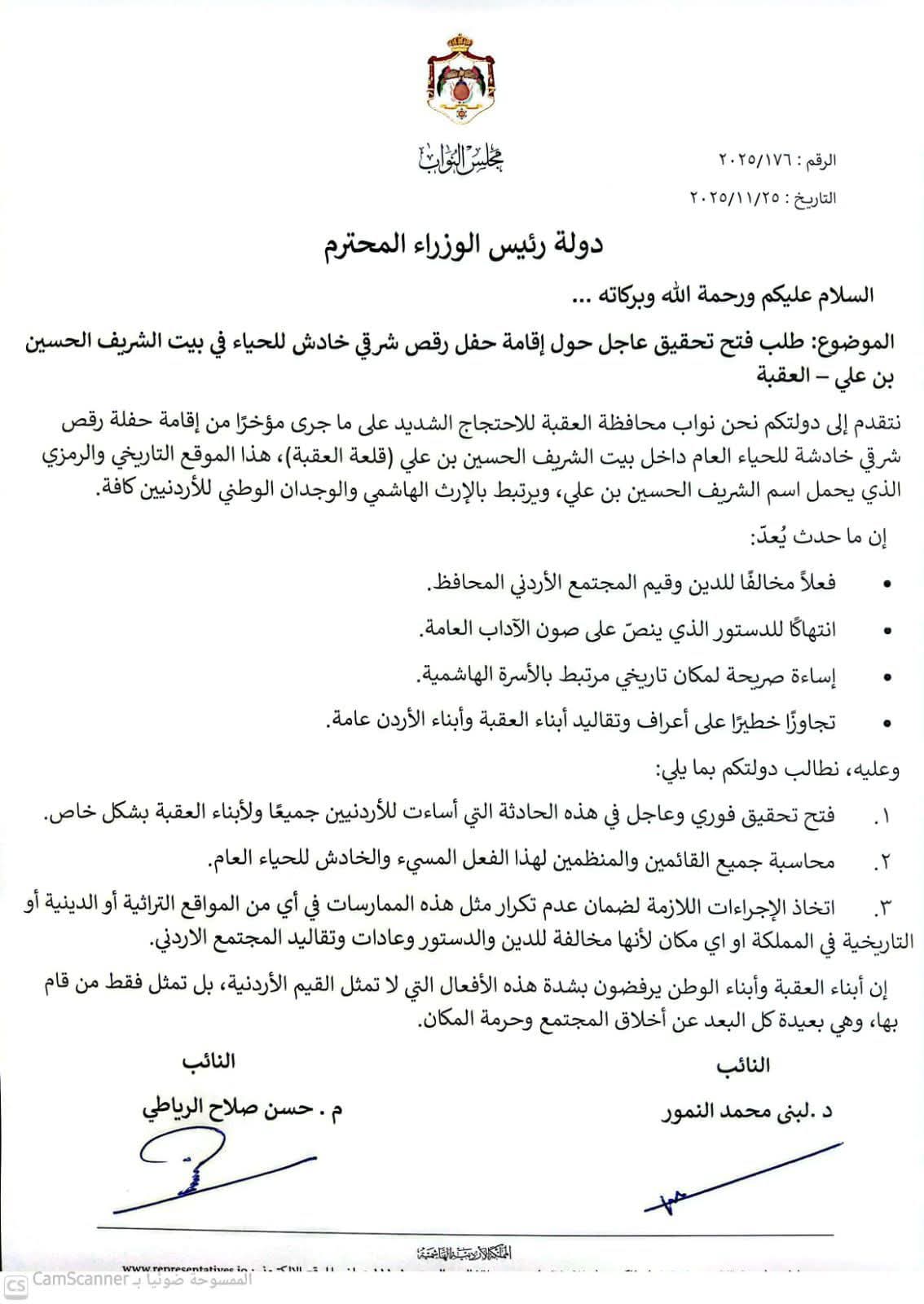 وجّه نواب العقبة مذكرةً نيابية عاجلة إلى رئيس الوزراء، على خلفية إقامة فعالية وُصفت بأنها "حفل رقص شرقي" داخل بيت الشريف الحسين بن علي (قلعة العقبة)، معتبرين ما جرى تجاوزاً للقيم الدينية والاجتماعية ومساساً برمزية المكان التاريخية.