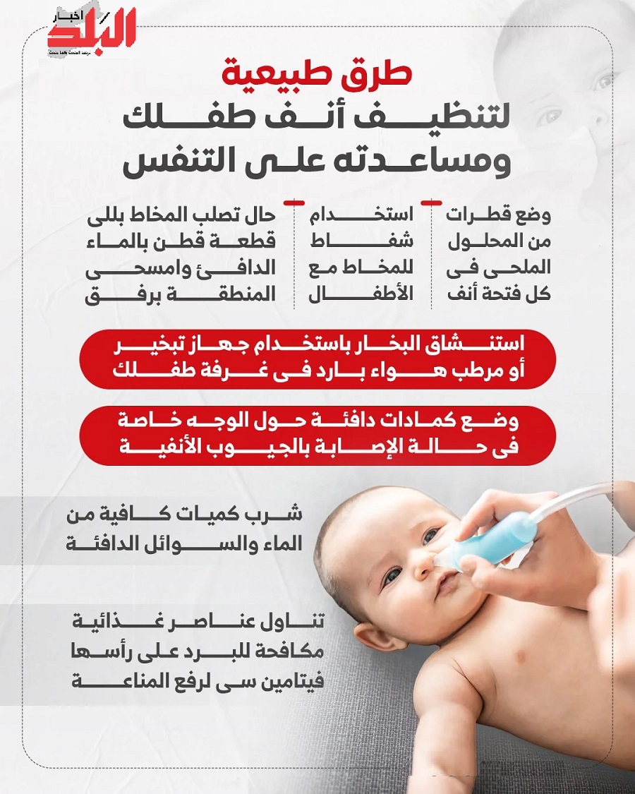 وفى حالة انزعاج طفلك من انسداد الأنف، توجد طرق طبيعية تساعد على تنظيف أنفه ومساعدته على التنفس بطريقة طبيعية، وفقا لموقع "Web MD".