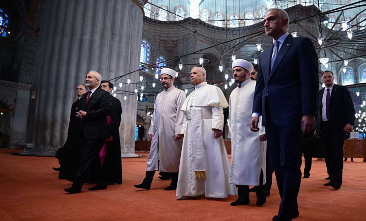 وانحنى أول بابا أمريكي قليلا قبل دخول المسجد واصطحبه إمام المسجد ومفتي إسطنبول في جولة في المجمع الواسع، الذي يتسع لعشرة آلاف مصل.