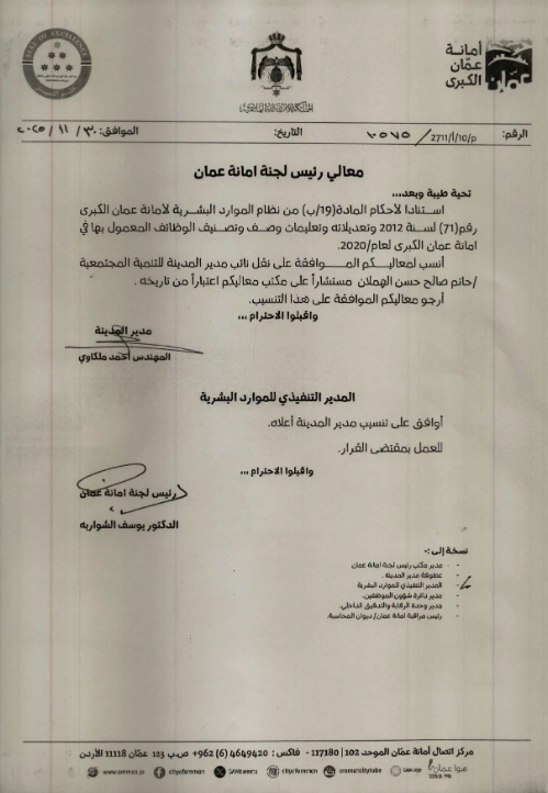 صدرت أمانة عمان، قائمة تنقلات شاملة شملت مدراء تنفيذيين ومدراء ورؤساء أقسام، في إطار جهودها لتعزيز الأداء المؤسسي وتحسين سير العمل في مختلف القطاعات داخل الأمانة.