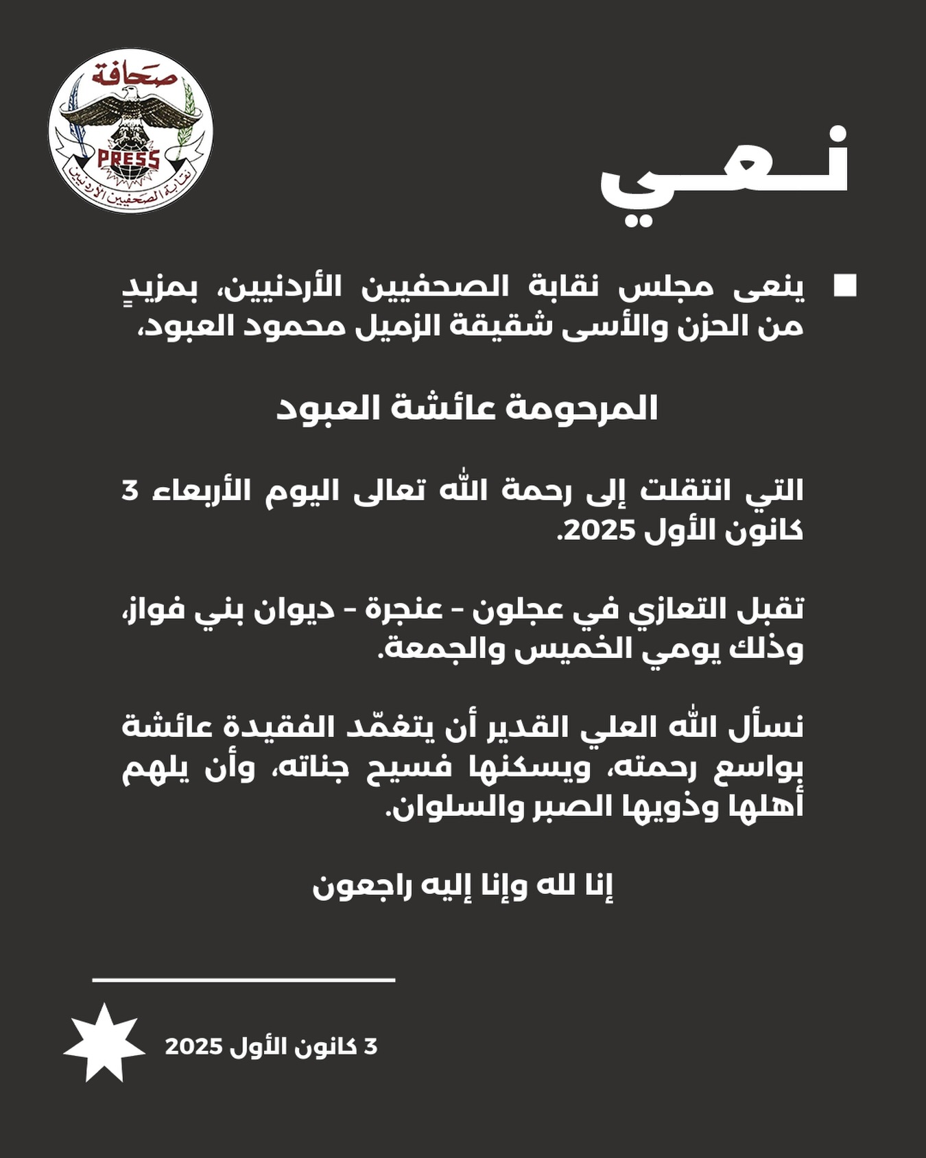ينعى مجلس نقابة الصحفيين الأردنيين، بمزيدٍ من الحزن والأسى شقيقة الزميل محمود العبود، المرحومة عائشة العبود، التي انتقلت إلى رحمة الله تعالى اليوم الأربعاء 3 كانون الأول 2025.