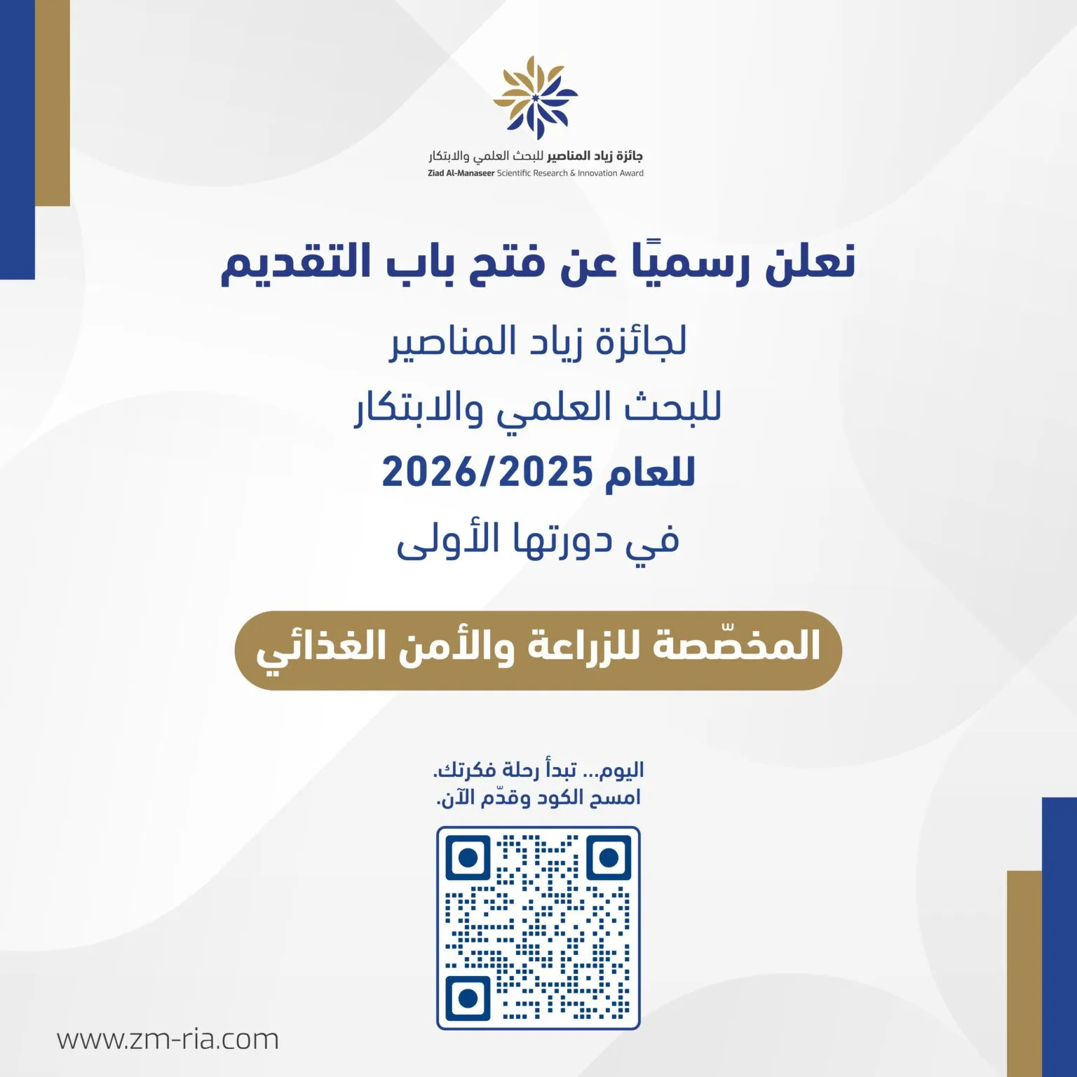 يبدأ تقديم الطلبات اعتبارًا من 2025/12/12 عبر الموقع الإلكتروني للجائزة، الذييتضمن نماذج التقديم التفصيلية لكل فئة، ومعايير التقييم، والخطّ الزمني للدورةالأولى، وذلك من خلال الرابط: https://zm-ria.com