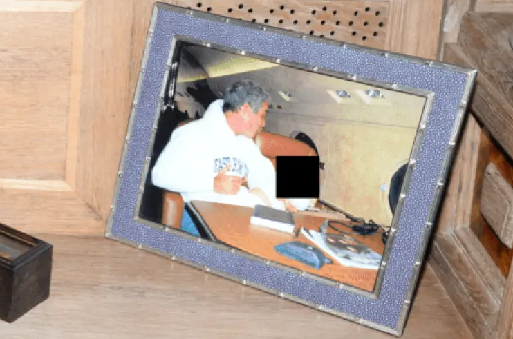 وتُظهر صورة أخرى إبستين وهو يبتسم على نطاق واسع بينما يجلس على مقعد فاخر في طائرة خاصة، وقد لفّ ذراعه حول فتاة صغيرة ترتدي سترة بلون أزرق فاتح.
