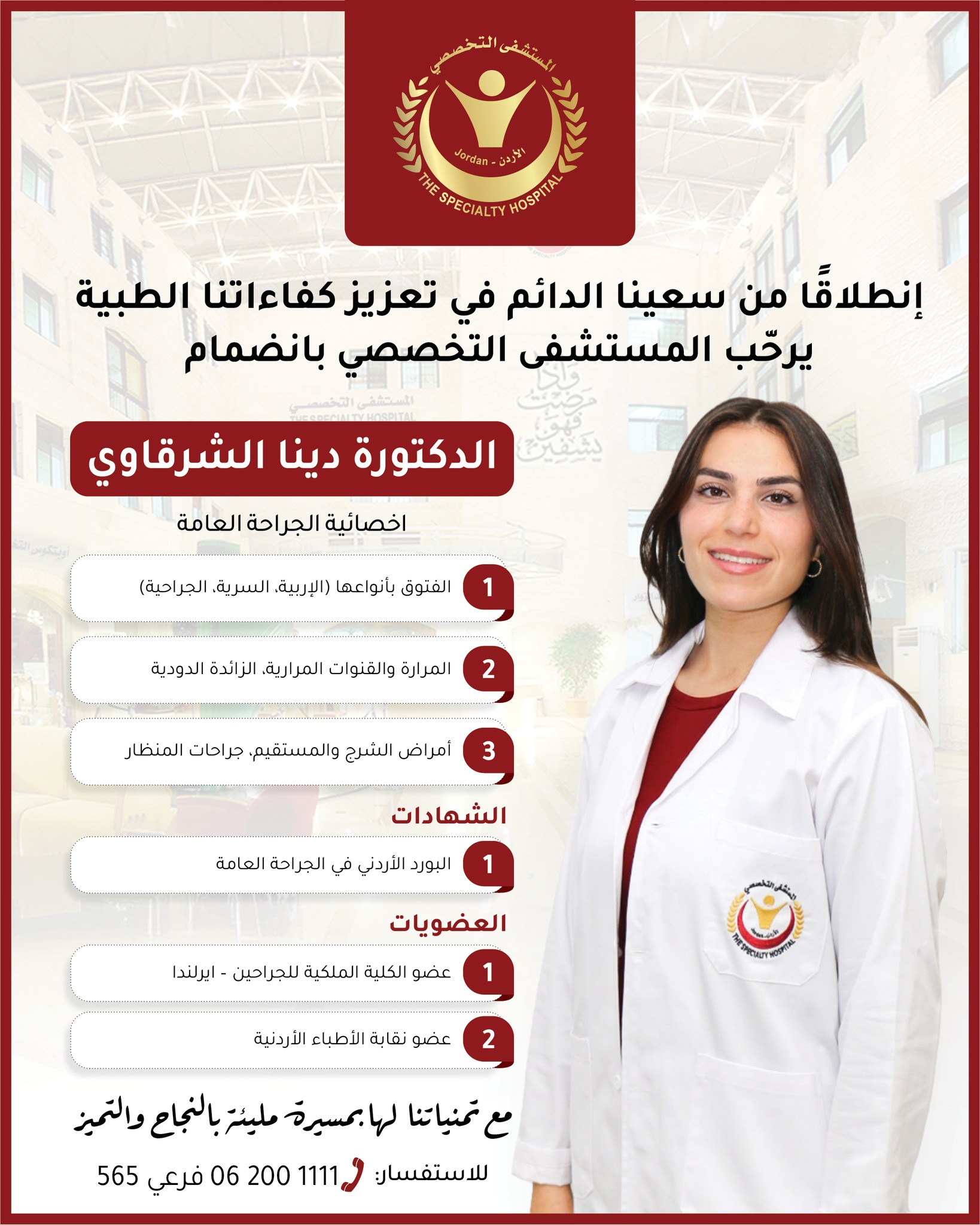 أعلن المستشفى التخصصي عن انضمام الدكتورة دينا الشرقاوي أخصائية الجراحة العامة إلى كادر عيادات المستشفى .