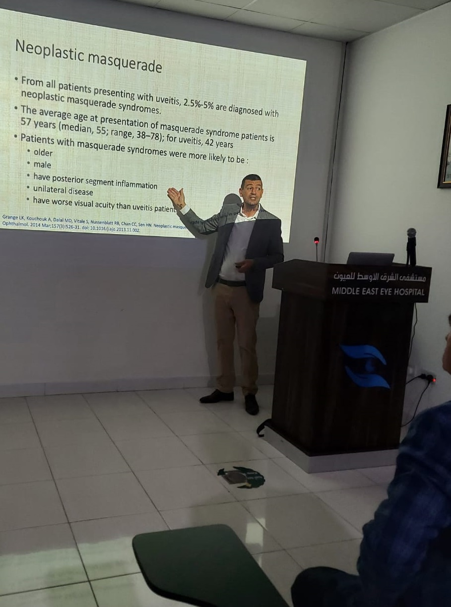 بحضور الدكتور موسى بيضون مدير مستشفى الشرق الأوسط للعيون نظم في قاعة المستشفى محاضرة طبية علمية بعنوان Masquerade in Uveitis قدمها الأستاذ المشارك الدكتور عمر سالم استشاري طب وجراحة العيون حضرها نخبة من أطباء مستشاري ومقيمي طب وجراحة العيون ومعنيين في طب العيون.