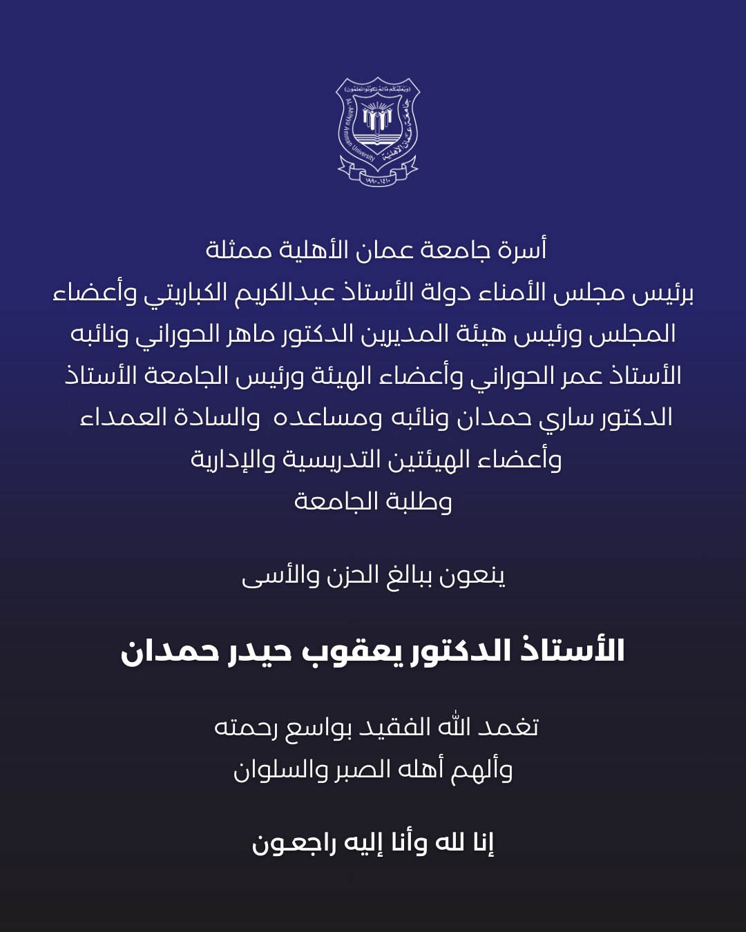 أسرة جامعة عمان الأهلية ممثلة