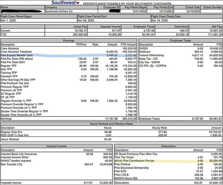 نشر الطيار كوربين ويليامز صورة لما يبدو أنه كشف راتب لشركة طيران ساوث ويست، وفقا لـ"الديلي ميل"، موضحًا أنه بعد عامين ونصف العام فقط كطيار، بلغ إجمالي أرباحه 292,260 دولارًا أمريكيًا.