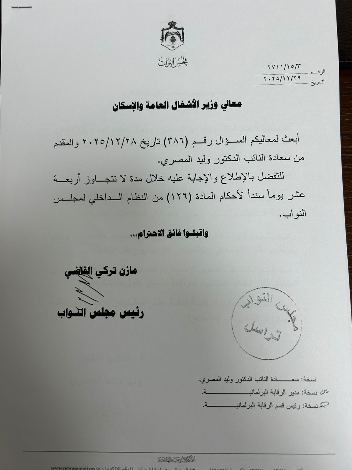 وجّه النائب الدكتور وليد المصري سؤالاً نيابياً إلى وزير الأشغال العامة والإسكان، المهندس ماهر أبو السمن عبر رئاسة المجلس طالب فيه الوزير بتوضيح الإجراءات الفعلية لضمان جودة المشاريع الكبرى للطرق والجسور وطلب النائب في سؤاله معرفة إجراءات مراقبة التكاليف والجدول الزمني خاصة في المحافظات النائية،