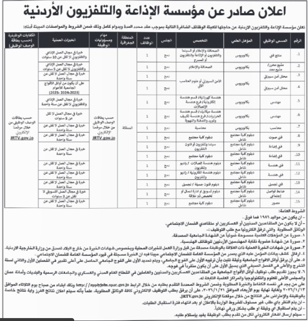 اعلنت مؤسسة الاذاعة والتلفزيون اليوم الاحد عن حاجتها لتعبئة وظائف شاغرة