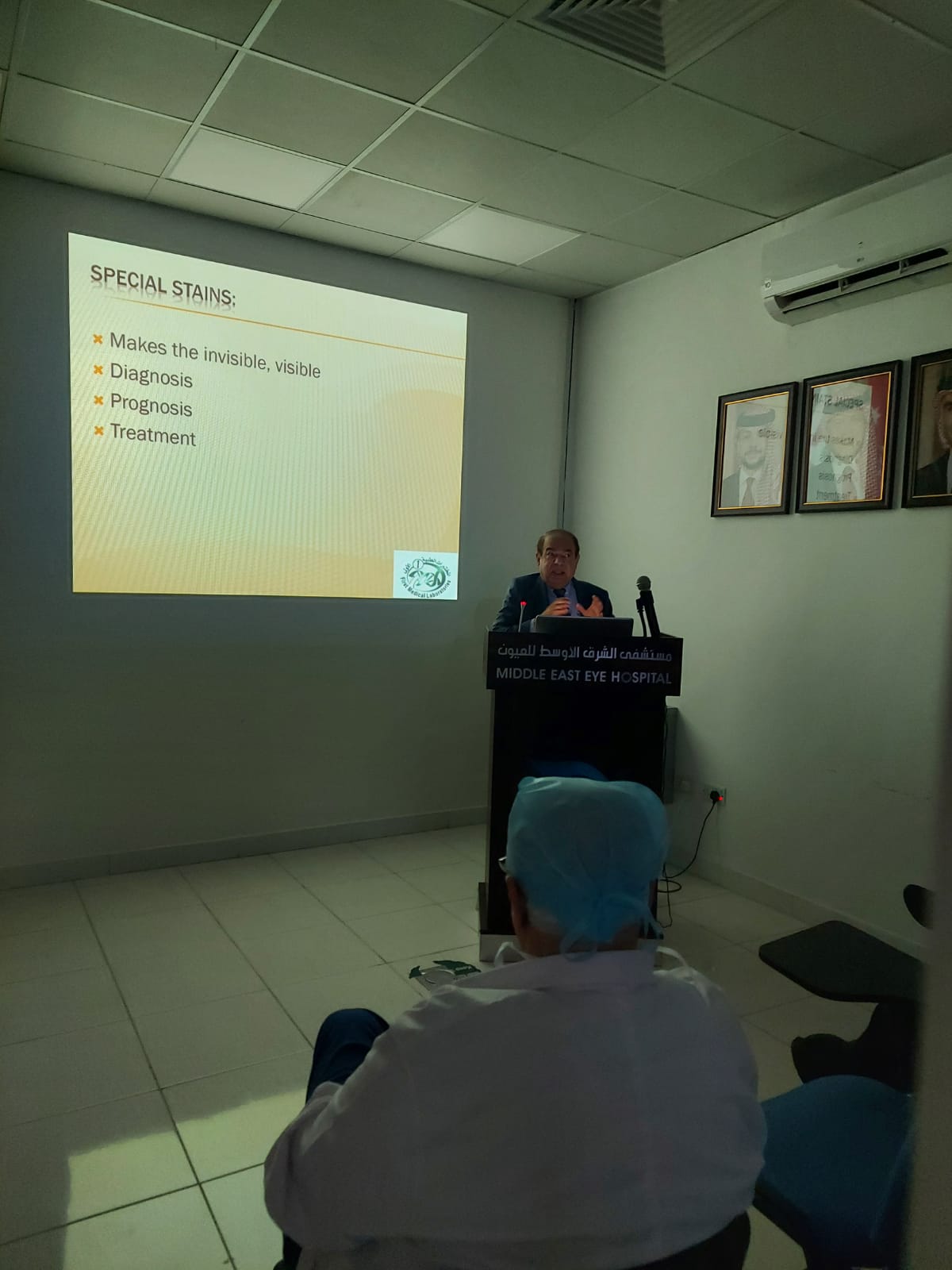 بحضور الدكتور موسى بيضون مدير مستشفى الشرق الأوسط للعيون نظم في قاعة المستشفى محاضرة طبية علمية بعنوان " Pathology for Ophthalmologist Part I قدمها الدكتور حسام أبو فرسخ – استشاري تشخيص الأمراض النسيجية والسريرية حضرها نخبة من أطباء مستشاري ومقيمي طب وجراحة العيون ومعنيين في طب العيون.