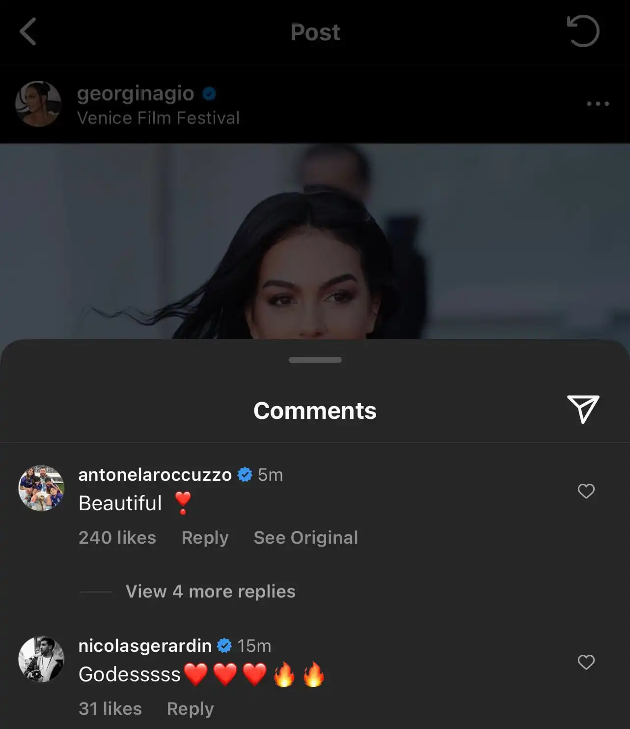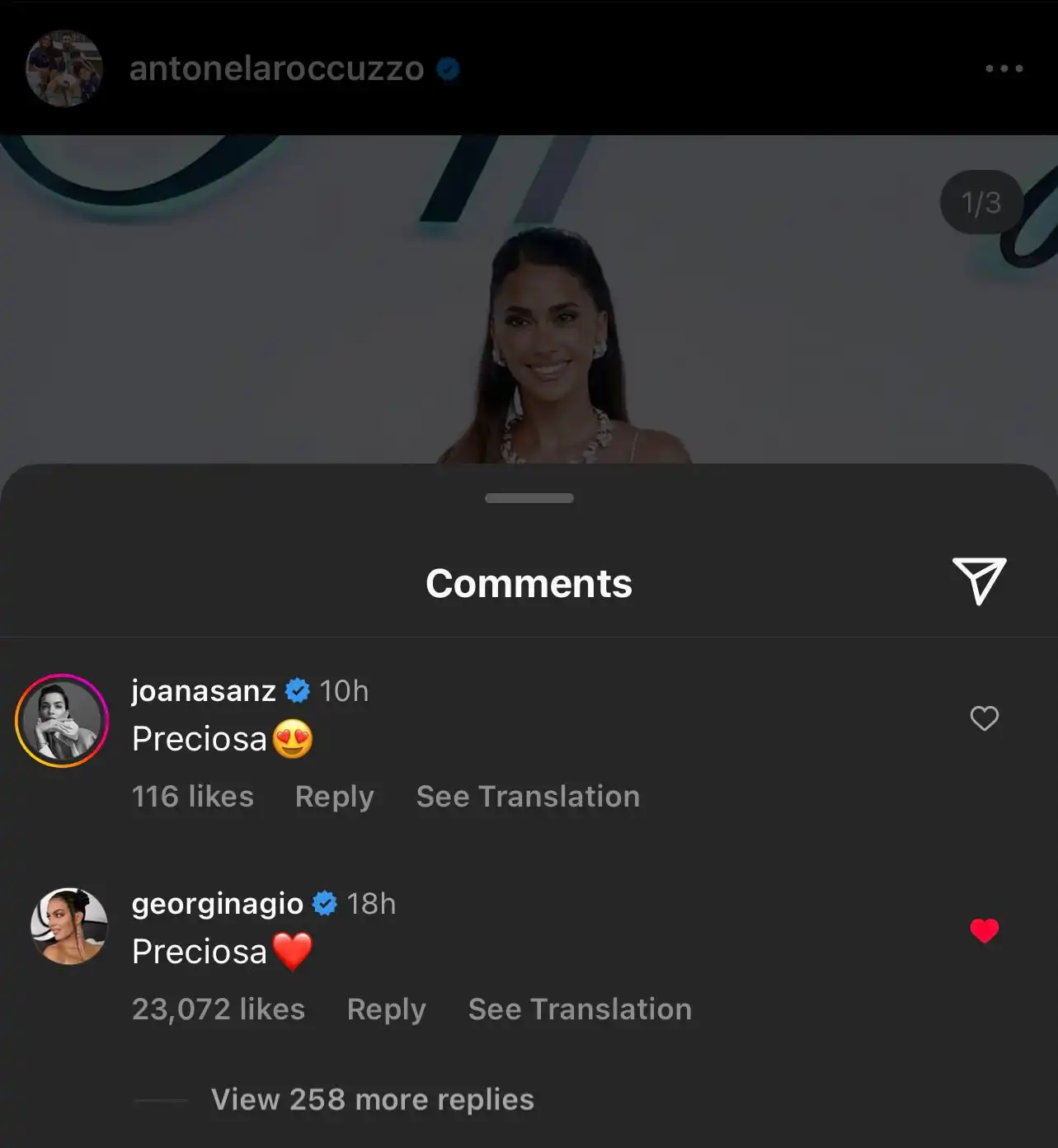 وردت جورجينا سريعًا على صورة نشرتها أنتونيلا عبر حسابها، وكتبت كلمة "Preciosa"، وهي من الكلمات الإسبانية التي تحمل دلالة المودة والتقدير.