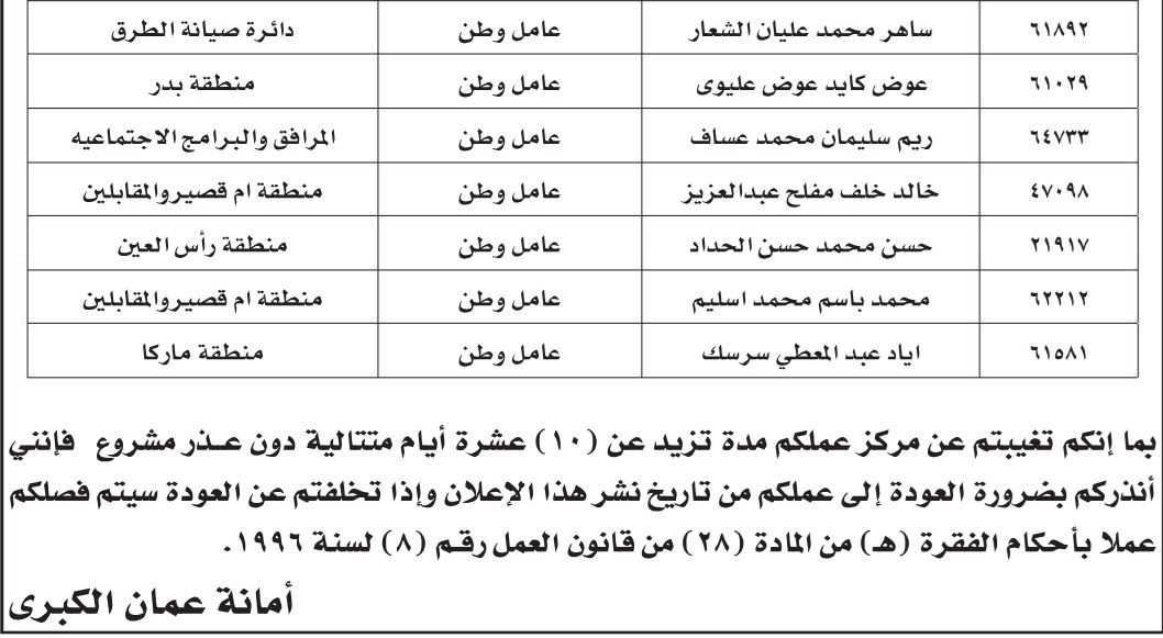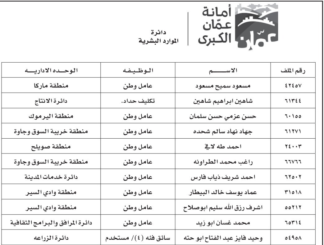 أنذرت أمانة عمان الكبرى اليوم الاحد الموظفين المذكورة أسماؤهم أدناه، المتغيبين عن مراكز عملهم مدة تزيد على عشرة أيام متتالية دون عذر مشروع، بضرورة العودة إلى عملهم  تجنباً للفصل من العمل، عملا بأحكام قانون العمل".