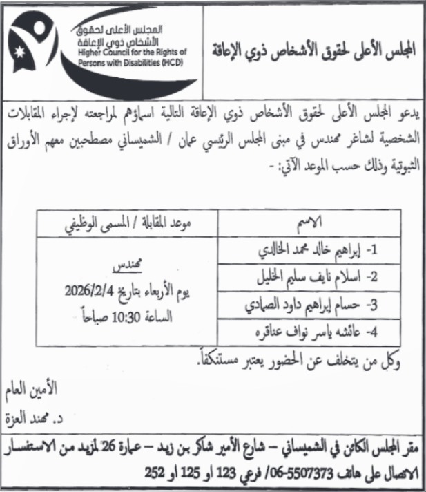 أخبار البلد -   يدعو المجلس الاعلى لحقوق الاشخاص ذوي الاعاقة التالية اسماؤهم لاجراء المقابلات الشخصية.