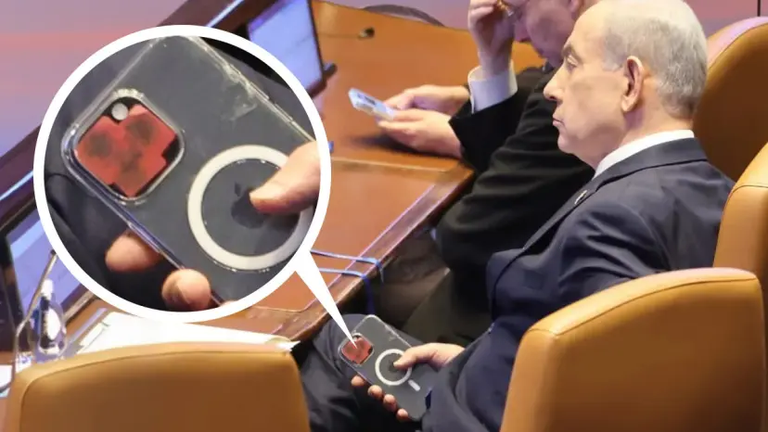 ووفق ما طالعته «العين الإخبارية» في صحيفة «معاريف» الإسرائيلية، التقطت الكاميرات صورا لرئيس الوزراء بنيامين نتنياهو ممسكا بهاتف محمول من نوع "آيفون"، عليه ملصقات حمراء على عدسة الكاميرا، الأمر الذي أثار تساؤلات عالمية.