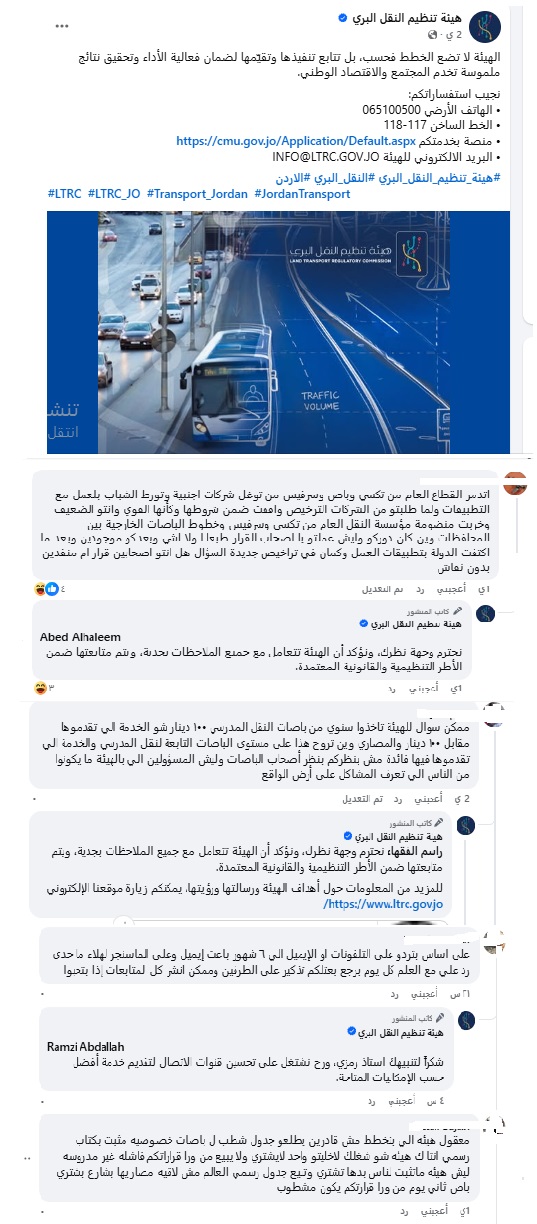 الجديد اليوم هو دخولها السوشال ميديا والمواجهة مع الجمهور واستقبالها للعديد من الاسئلة والاستيضاحات والنقد سواء كان في محله أو غير ذلك ، وقد جاءت ردودها باردة لا تفيد السائل .. فالاجابات والردود استخدمت بدبلوماسية لا تغن ولا تسمن من جوع ، لا بل تغث المعدة، والمتتبع لصفحة هيئة النقل على الفيسبوك ولو أخذت عينة واحدة او خبر من الاخبار لوجدت اسئلة عديدة من أبناء القطاع ومظالم واستفسارات ونقد يظهر القطاع كله ساخط لا تجد من يشكر او يثني او ينصف فكرة او قرار او خطوة ، وكأن هيئة النقل في واد والآخرون في واد آخر..