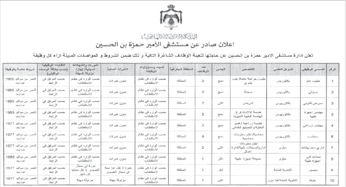 اعلن مستشفى الأمير حمزة، اليوم الثلاثاء، عن حاجته لتعبئة وظائف شاغرة.