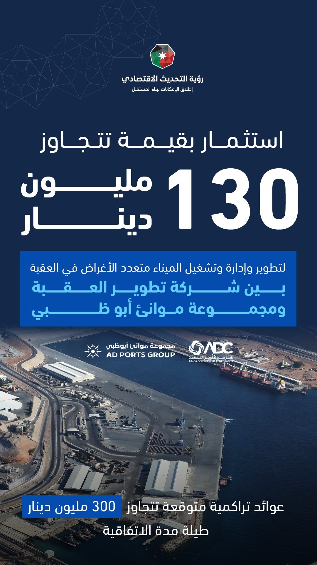 وقّعت شركة تطوير العقبة ومجموعة موانئ أبوظبي، الخميس، اتفاقية استثمارية تتجاوز قيمتها 130 مليون دينار لتطوير وإدارة وتشغيل الميناء متعدد الأغراض في العقبة، ضمن شراكة استراتيجية تنسجم مع رؤية التحديث الاقتصادي وتعزز موقع العقبة كمركز لوجستي إقليمي.