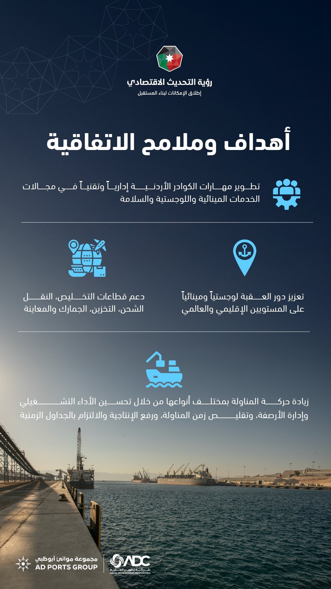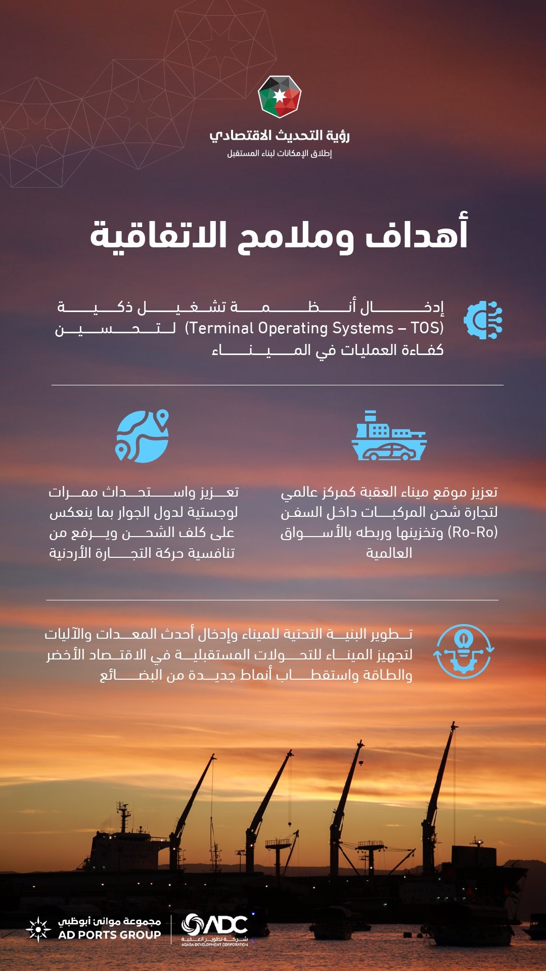 كما تهدف الشراكة إلى تعزيز موقع ميناء العقبة كمركز عالمي لتجارة شحن المركبات داخل السفن وتخزينها وربطها بالأسواق العالمية، وتطوير ممرات لوجستية لدول الجوار بما ينعكس على خفض كلف الشحن ورفع تنافسية حركة التجارة الأردنية.
