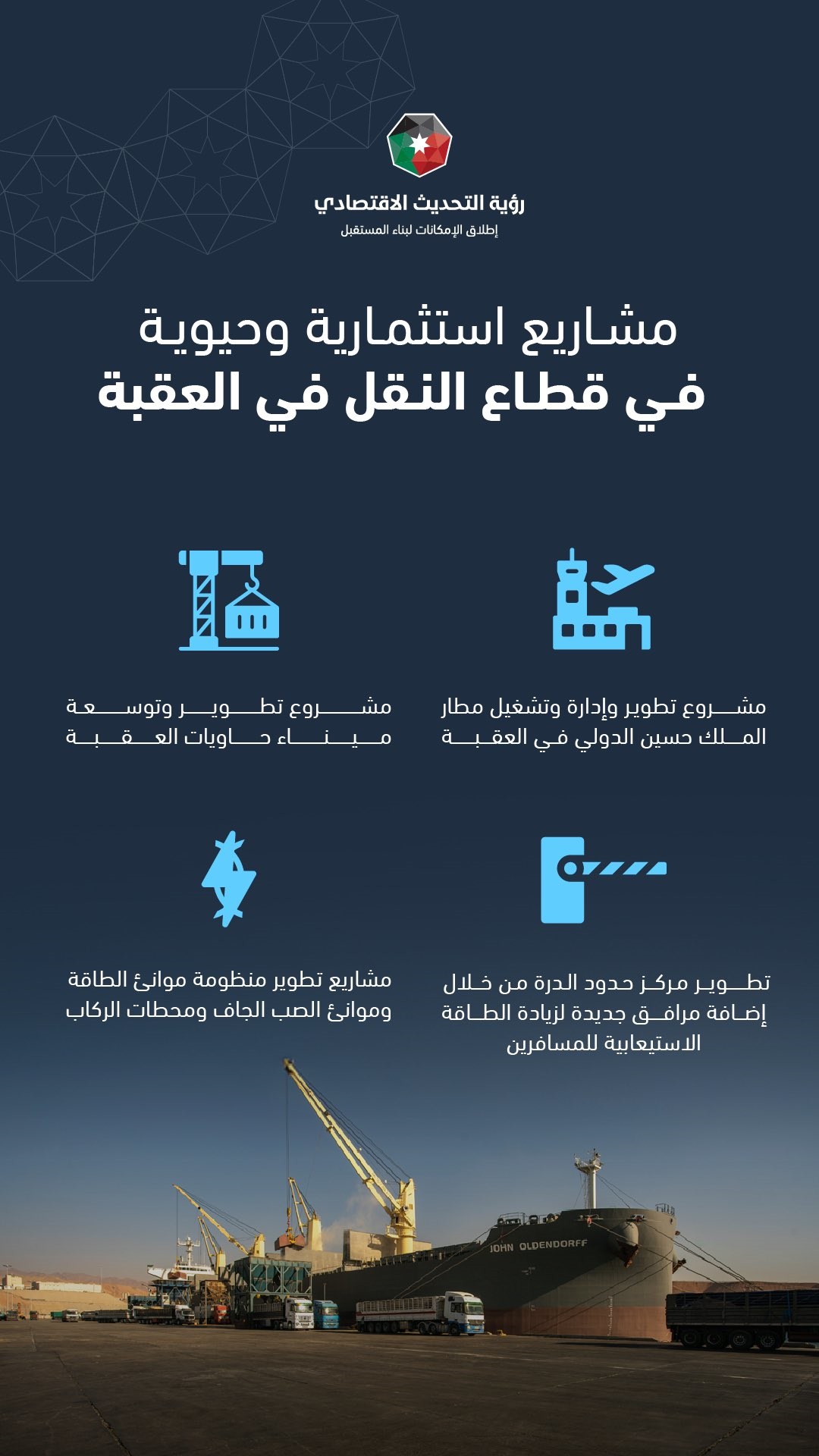 ويأتي المشروع، ضمن مشاريع استثمارية حيوية في قطاع النقل في العقبة، تشمل مشروع تطوير منظومة الموانئ والطاقة وموانئ الصب الجاف ومحطات الركاب، إلى جانب تطوير مركز حدود الدرة عبر إضافة مرافق جديدة لزيادة الطاقة الاستيعابية للمسافرين، ودعم قطاعات التخليص والنقل والشحن والتخزين والجمارك والمعاينة.