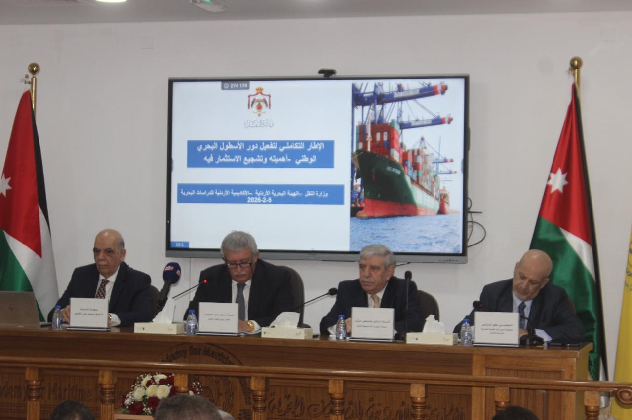 برعاية معالي الأستاذ الدكتور نضال القطامين، وزير النقل الأكرم، نظمت الأكاديمية الأردنية للدراسات البحرية، اليوم الخميس الموافق 5 شباط 2026، ورشة عمل وطنية بعنوان "الأسطول البحري الوطني – أهميته وتشجيع الاستثمار فيه”، وذلك في مقر الأكاديمية وبمشاركة نخبة من صناع القرار والخبراء والمختصين في القطاع البحري والنقل والاقتصاد.