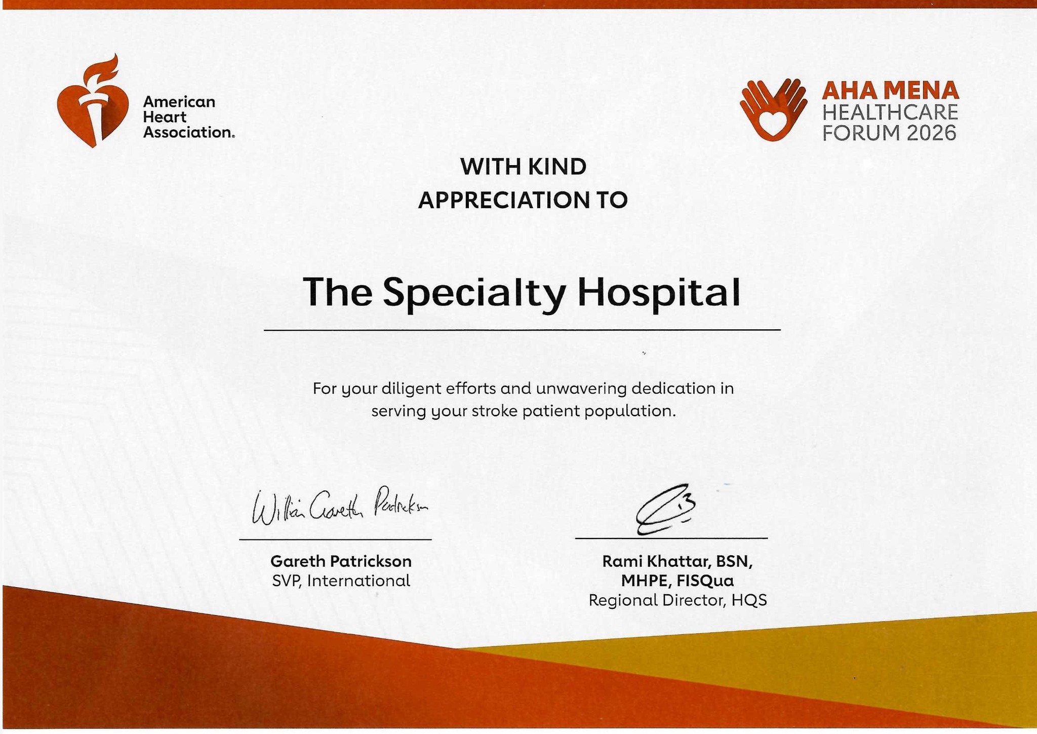 وخلال أعمال المنتدى، حاز المستشفى التخصصي على شهادة تقدير وتكريم رسمي من جمعية القلب الأمريكية (AHA)، تقديرًا لتميّزه في رعاية مرضى السكتات الدماغية، وتطبيقه أفضل الممارسات والمعايير العالمية في التشخيص والعلاج والاستجابة الطارئة، بما يسهم في إنقاذ الأرواح.