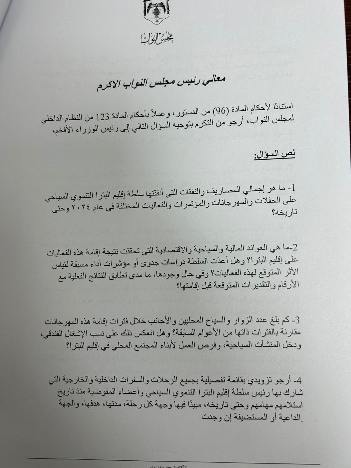 جاء فيه انه حتى هذه اللحظة لم يكلّف رئيس سلطة إقليم البترا نفسه عناء الرد على سؤال المقدم من قبلي والمتعلّق بالمصاريف التي صُرفت وبالحالة السياحية في البترا في وقت تمرّ فيه المدينة بمرحلة تدهور سياحي غير مسبوقة منذ سنوات طويلة.