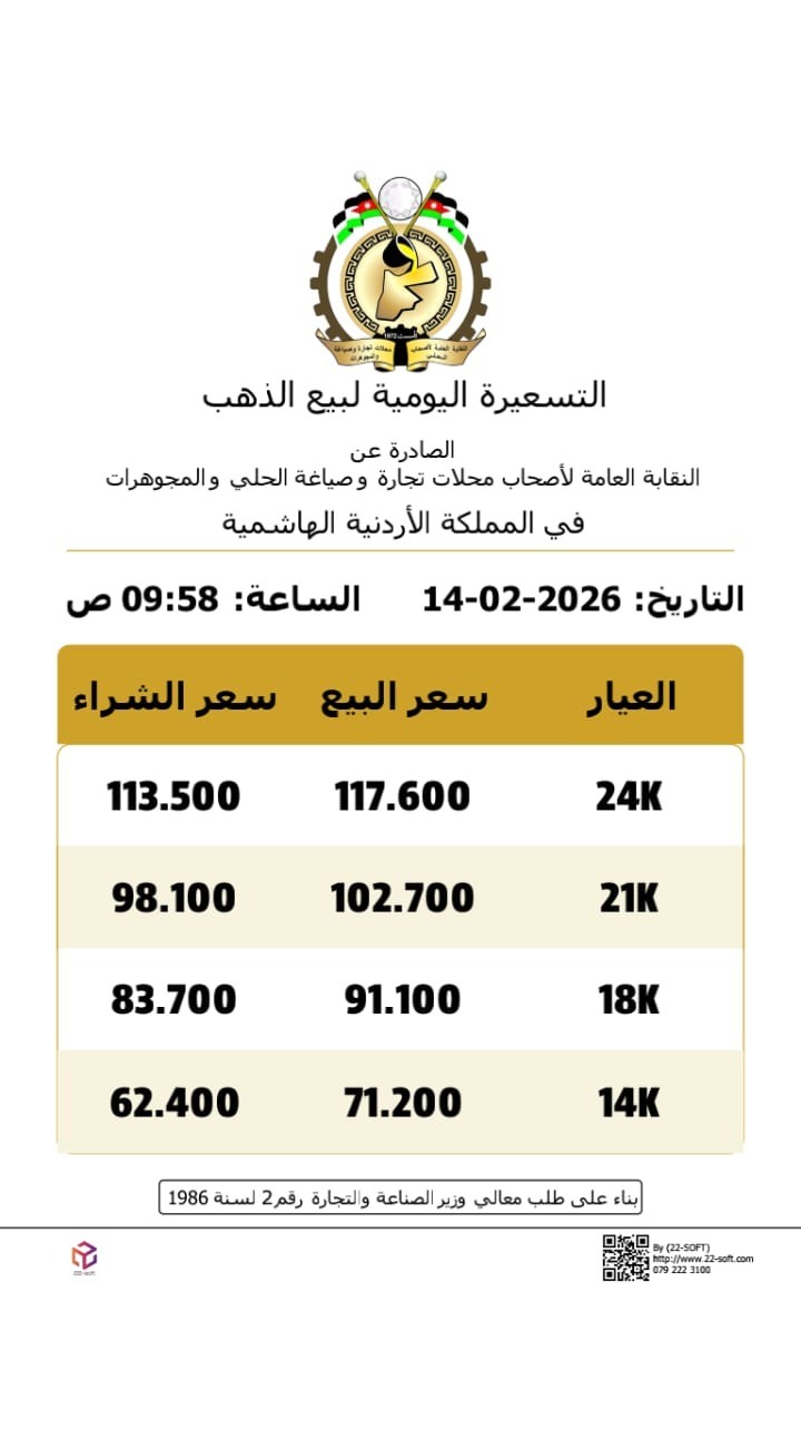 أخبار البلد - شهدت أسعار الذهب في السوق المحلية الأردنية، اليوم السبت الموافق 14 شباط 2026، ارتفاعًا ملحوظًا وفق التسعيرة اليومية الصادرة عن النقابة العامة لأصحاب محلات تجارة وصياغة الحلي والمجوهرات في المملكة.