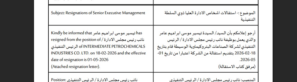 حيث تم نشر عدة افصاحات خاصة بالشركة على موقع بورصة عمان الأول يتعلق باستقالة الرئيس التنفيذي للشركة الدكتور تيسير عامر حيث نشرت الشركة افصاحاً تعلن به هذا الخبر جاء به ارجو اعلامكم بان السيد تيسير موسى عامر والذي يعمل بوظيفة نائب رئيس مجلس الادارة الرئيس التنفيذي لشركة الصناعات البتروكيمياوية الوسيطة قام بتاريخ 18-2 بتقديم استقالة من الشركة اعتبارا من 1-5-2026.