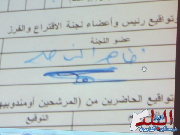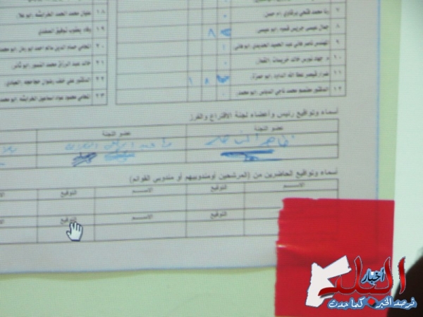 وعرض جريسات صوراً يقول فيها : أنها دليله على تزوير النتائج حيث استعرض صورة لمحضر غير موقع اضافة إلى اخر يظهر فيها ان عدد الاصوات التي حصل عليها هي صفر ، وصورة لتغير ارقام الصندوق .