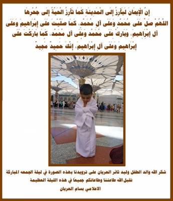 شكر الله والد الطفل حفيدنا الغالي وليد ثائر ولبد العريان الذي زودنا بهذه الصورة من مدينة رسول الله صلى الله عليه وسلم في ليلة الجمعه المباركة وتقبل الله منا ومنكم جميل عبادات وطاعات يوم الجمعه وتقبل الله عمرتك ياوليد وغفر الله لك ولوالديك ولوالد والديك ولنا ولكم ولسائر المسلمين والمسلمات الاحياء منهم والاموات وآخر دعوانا أن الحمد لله