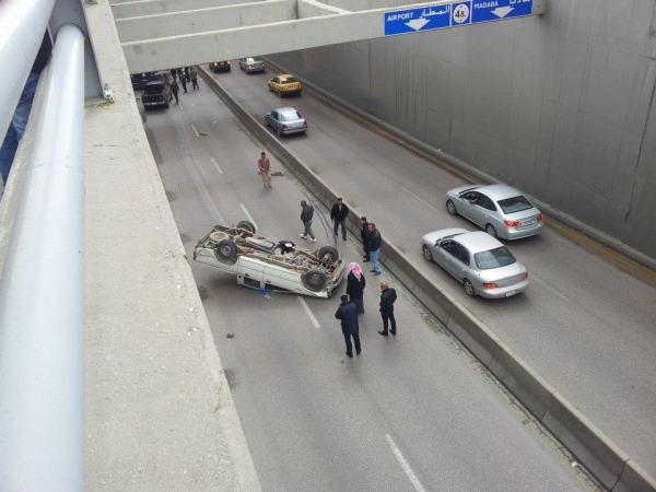 تدهورت سيارة من اعلى جسر الدوار السابع لتحط بداخل النفق ووفق شهود عيان ان سائق السيارة اصيب بجروح طفيفة .