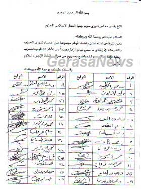 ووقع 32 عضوا من شورى الجبهة على مذكرة طالبوا فيها بفصل كل اعضاء الجبهة المنضوين تحت لواء ما بات يعرف بمبادرة زمزم ,غير إن عددا من أعضاء المجلس لم يوافقوا على مناقشة المذكرة في جلسة السبت .