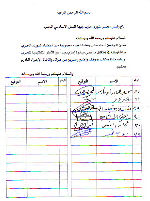 رفع مجلس شورى حزب جبهة العمل الإسلامي جلسته صباح السبت بسبب فقدان اكتمال النصاب،وكشفت مصادر داخل الحزب عن مذكرة قدمها حوالي 31 عضواً في الجلسة، لمناقشة محاسبة أعضاء الشورى المنضوين تحت مظلة المبادرة الوطنية للبناء أو ما عرفت بمبادرة 'زمزم'.