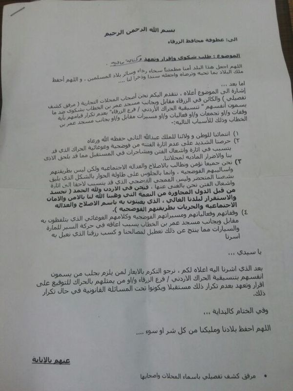 بعد الذي اشرنا اليه اعلاه لكم ، نرجو التكرم بالايعاز لمن يلزم بجلب من يسمون انفسهم بتنسيقية الحراك الاردني / فرع الزرقاء / او من يمثلهم بالحراك للتوقيع على اقرار وتعهد بعدم تكرار ذلك مستقبلاً ويكونوا تحت المسائلة القانونية في حال تكرار ذلك .