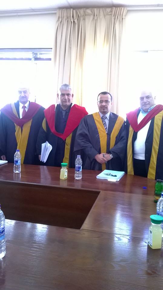 وقد تشكلت لجنة المناقشة من الاستاذ الدكتور بشير الزعبي وأعضاء اللجنة أ.د يوسف منصور، أ.د طالب عوض، أ. د . فتحي العاروري، مع توصية اللجنة بطبع الاطروحة على شكل كتاب لعمق مضامينها وثراء موضوعاتها للمكتبة الاكاديمية .