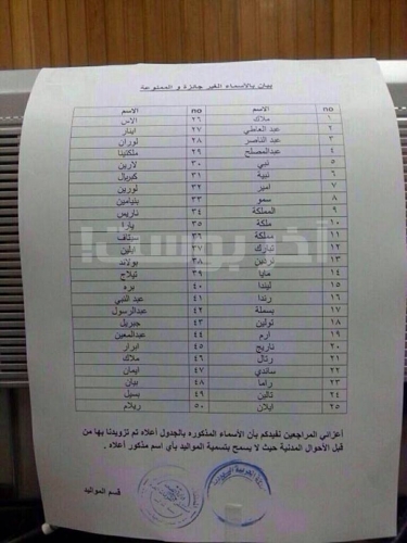 وتشمل قائمة الأسماء الممنوعة: ملاك، عبدالعاطي، عبدالناصر، عبدالمصلح، نبي، نبيه، أمير، سمو، المملكة، ملكة، مملكة، تبارك، نردين، مايا، ليندا، رندا، بسملة، تولين، أرم، ناريج، رتال، ألس، ساندي، راما، مالين، أيلين، الاس، أينار، لوران، ملكتينا، لارين، كبريال، لورين، بنيامين، ناريس، يارا، سيتاف، أيلين، لولاند، تيلاج، بره، عبدالنبي، عبدالرسول، جبريل، عبدالمعين، أبرار، مِلاك، أيمان، بيان، بسيل، وريلام.