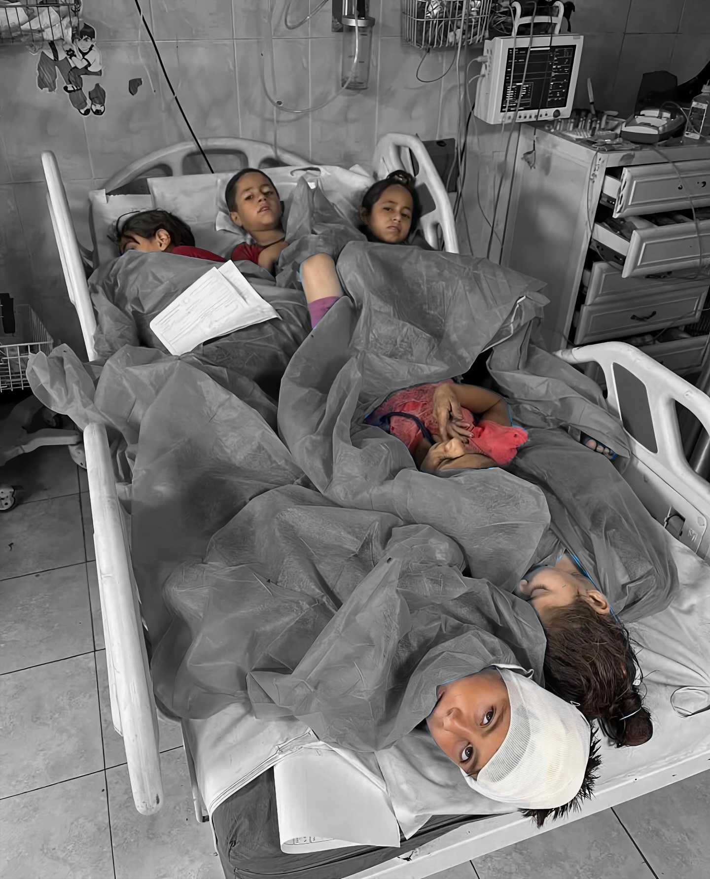 بسبب الاكتظاظ الشديد وقلة الإمكانيات في المشافي.. 6 أطفال جرحى على سرير واحد في إحدى مستشفيات قطاع غزة