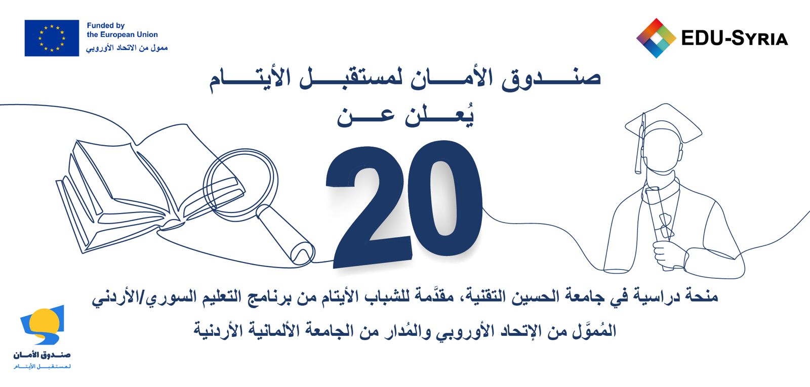 صندوق الأمان لمستقبل الأيتام يعلن عن 20 منحة دراسية في جامعة الحسين التقنية مقدمة للشباب الأيتام من برنامج التعليم السوري / الأردني