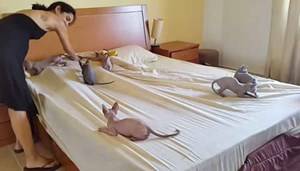 بالفيديو.. مجموعة قطط تُساعد امرأة على ترتيب سريرها!