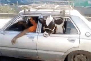 بقرة تحيِّي المارة من نافذة السيارة