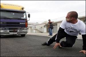 جورجي يسحب شاحنة وزنها 8 اطنان بأذنيه / فيديو