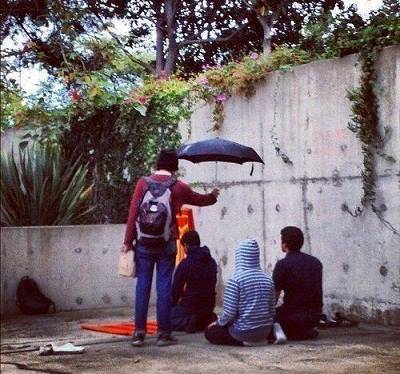 طالب غير مسلم يمسك المظله لزملائه اثناء صلاتهم تحت المطر